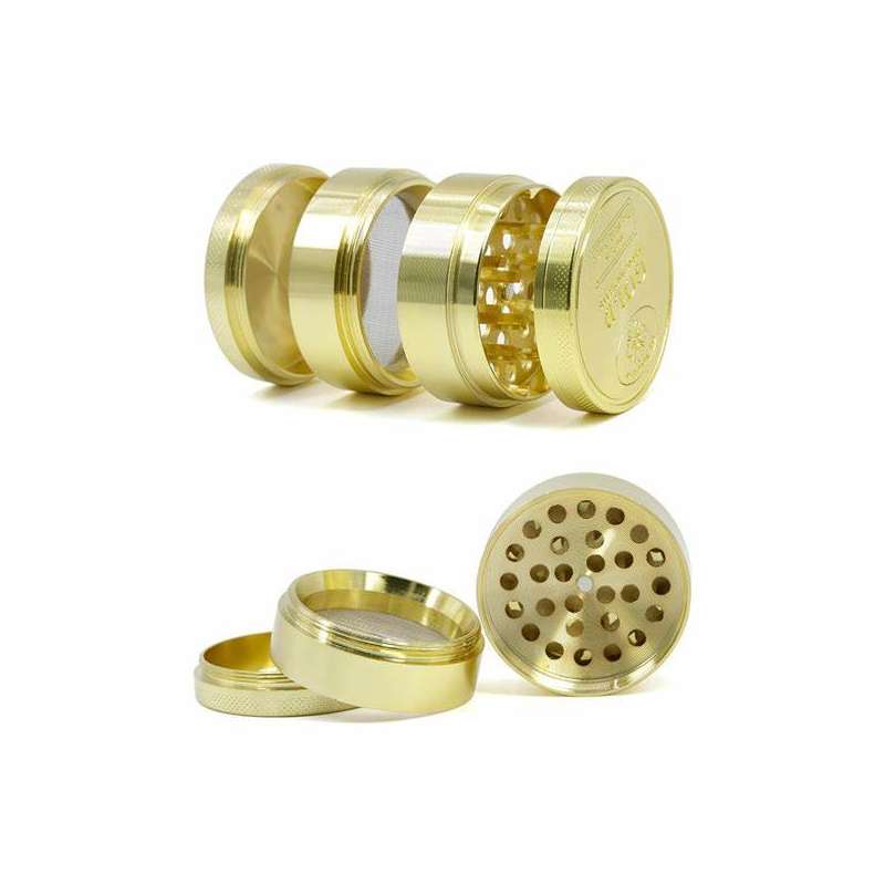 Grinder de metal dorado que consta de 4 partes incluido el polinizador. Es de 40mm de diámetro, 38 mm altura.